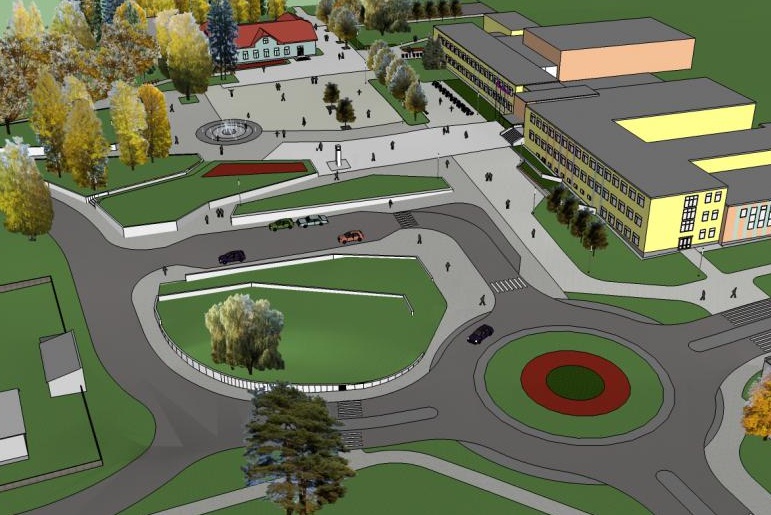 Projekta veidotāji atzīst, ka pilsētas centrālais laukums ir pakārtots satiksmes organizācijai, prioritāte ir mašīnas! Laukuma bruģētās platības lielums esot variējams. Laukumā būšot pulkstenis pretī skolas ieejai, pa perimetru soliņi, kā arī egles vieta, kas vasarā pārtaps strūklakā. Pie skolas būšot arī atklāta tipa bērnu rotaļlaukums. Kastaņu rindu gar skolu vēlams likvidēt, jo tā aizēno skatu uz tautas namu… Laukuma malās būs atbalstsiena līdz 80 cm augstumā. Nogāzes būs principā vienīgās atlikušās zaļās zonas…