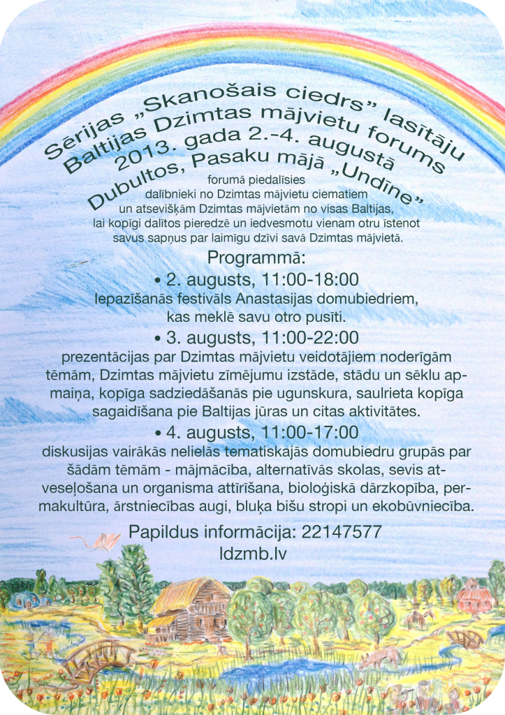 No 2. līdz 4. augustam Jūrmalā, Pasaku mājā “Undīne” notiks Baltijas Dzimtas mājvietu forums, uz kuru sabrauks potenciālie un esošie Dzimtas mājvietu veidotāji no visas Baltijas, lai kopīgi dalītos pieredzē un iedvesmotu vienam otru īstenot savus sapņus par laimīgu dzīvi savā Dzimtas mājvietā.